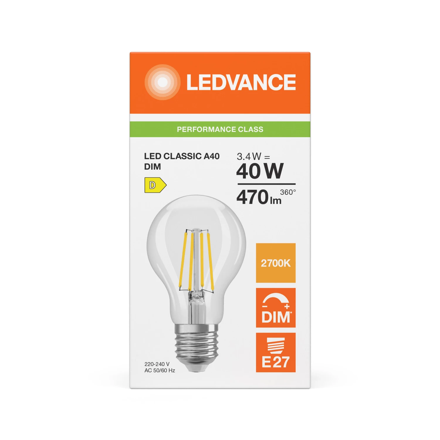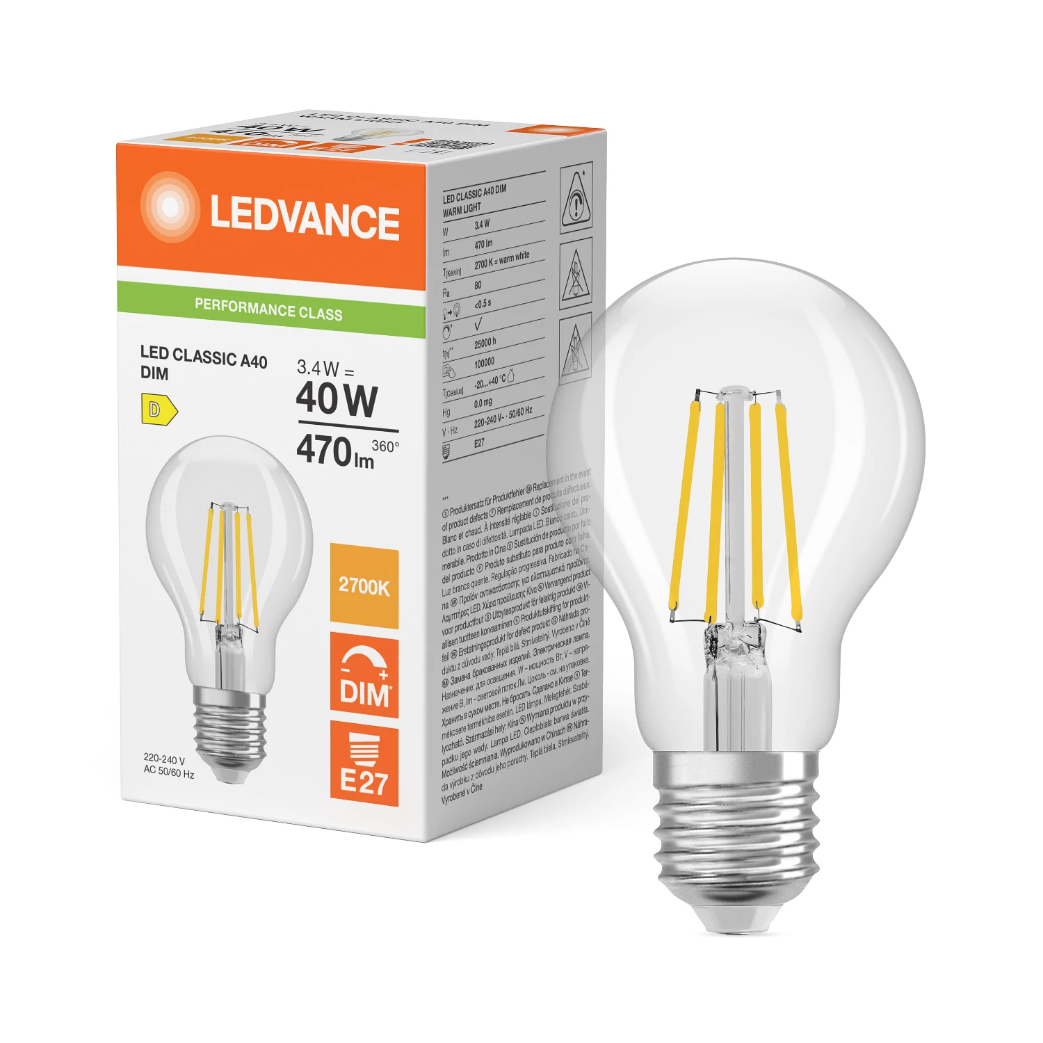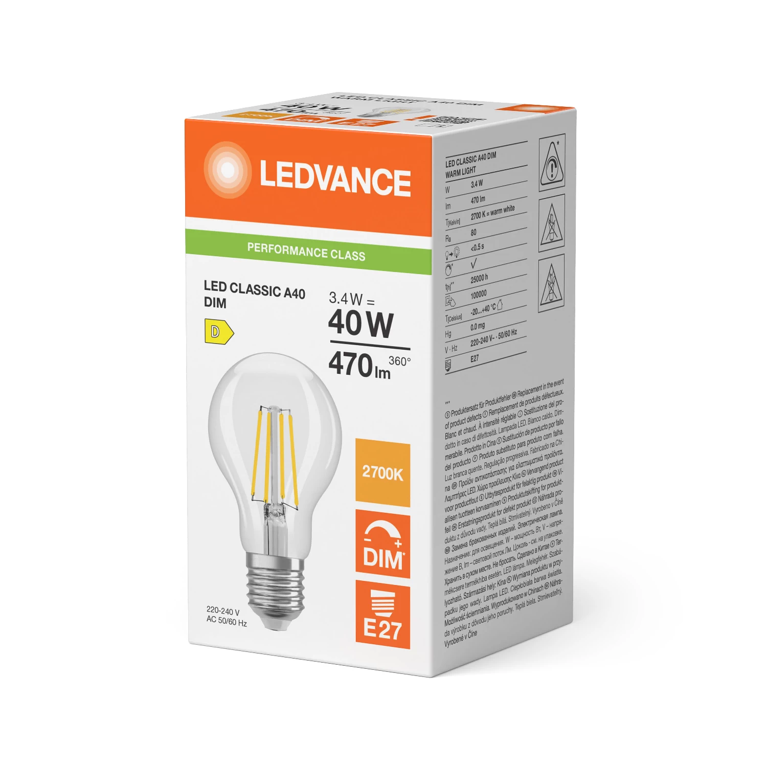 Táto LED žiarovka z radu Classic od renomovaného výrobcu LEDVANCE kombinuje tradičný dizajn s najmodernejšou technológiou. Vďaka číremu sklu a viditeľným LED vláknam (filament) pôsobí veľmi esteticky a je ideálnou náhradou za klasické 40W žiarovky. S príkonom iba 3.4W dosahuje svetelný tok 470 lm, čo z nej robí vysoko úsporný svetelný zdroj v energetickej triede D. Jej najväčšou prednosťou je možnosť stmievania, čím si vytvoríte dokonalú atmosféru v obývacej izbe aj spálni. Široký uhol vyžarovania až 300° zabezpečí rovnomerné osvetlenie celého priestoru bez tmavých kútov.