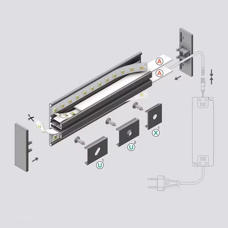 • šírka max.10mm – nalepenie LED pásika na pomocnú pásovinu a jej zasunutie do dutiny profilu z boku
