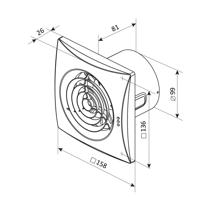 230 VAC, 7.5W, 49 mA, 97 m3/h, 25dBA, IP45, rozmer 158x107mm
