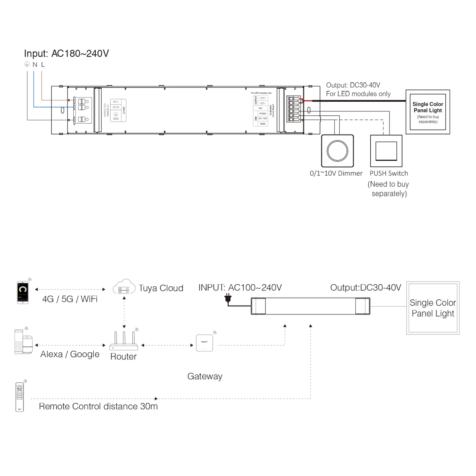 Zdroj ponúka mimoriadne plynulé stmievanie v rozsahu 0.1% až 100%, čo vám umožní vytvoriť dokonalú atmosféru v kanceláriách, hoteloch aj domácnostiach. Okrem RF signálu podporuje aj káblové stmievanie typu 0/1-10V, 10V PWM alebo klasické PUSH tlačidlo. Ak hľadáte plnohodnotné SMART ovládanie, po prepojení s bránou WL-Box2 získate prístup k aplikácii Tuya Smart a hlasovým asistentom ako Amazon Alexa či Google Assistant.