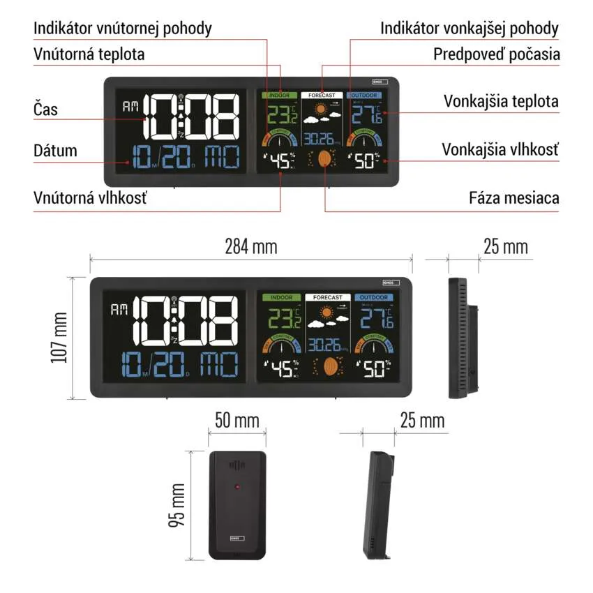 teplota, vlhkosť, barometer, kalendár, DCF hodiny, 284x25x107mm