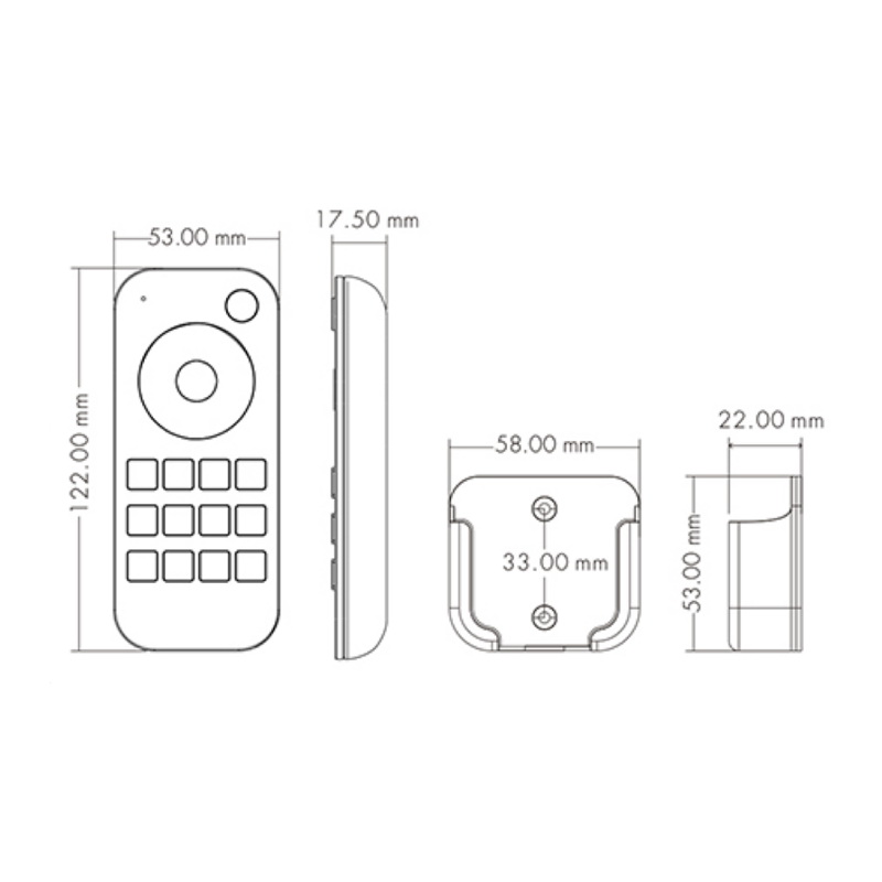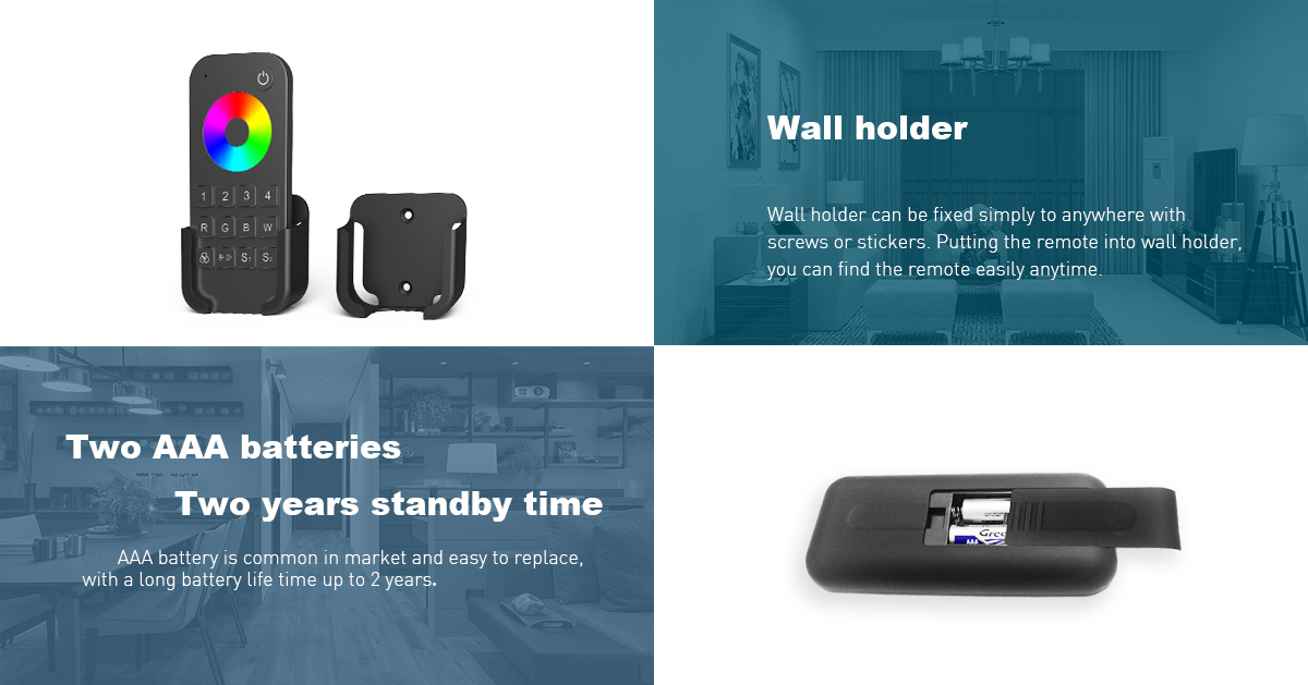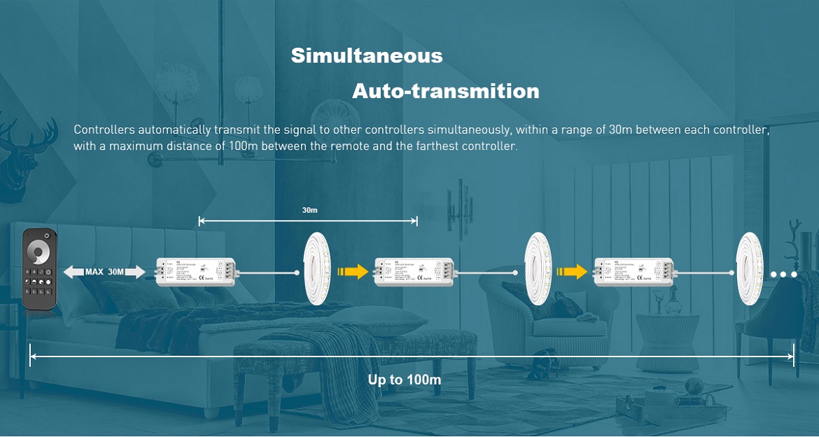 • vďaka rádiovému signálu je dosah ovládača až 20m, bez potreby priamej „viditeľnosti“ na riadiacu jednotku. Vďaka tomu môže byť riadiaca jednotka/prijímač schovaná napríklad v sadrokartónovom podhľade, alebo v skrini