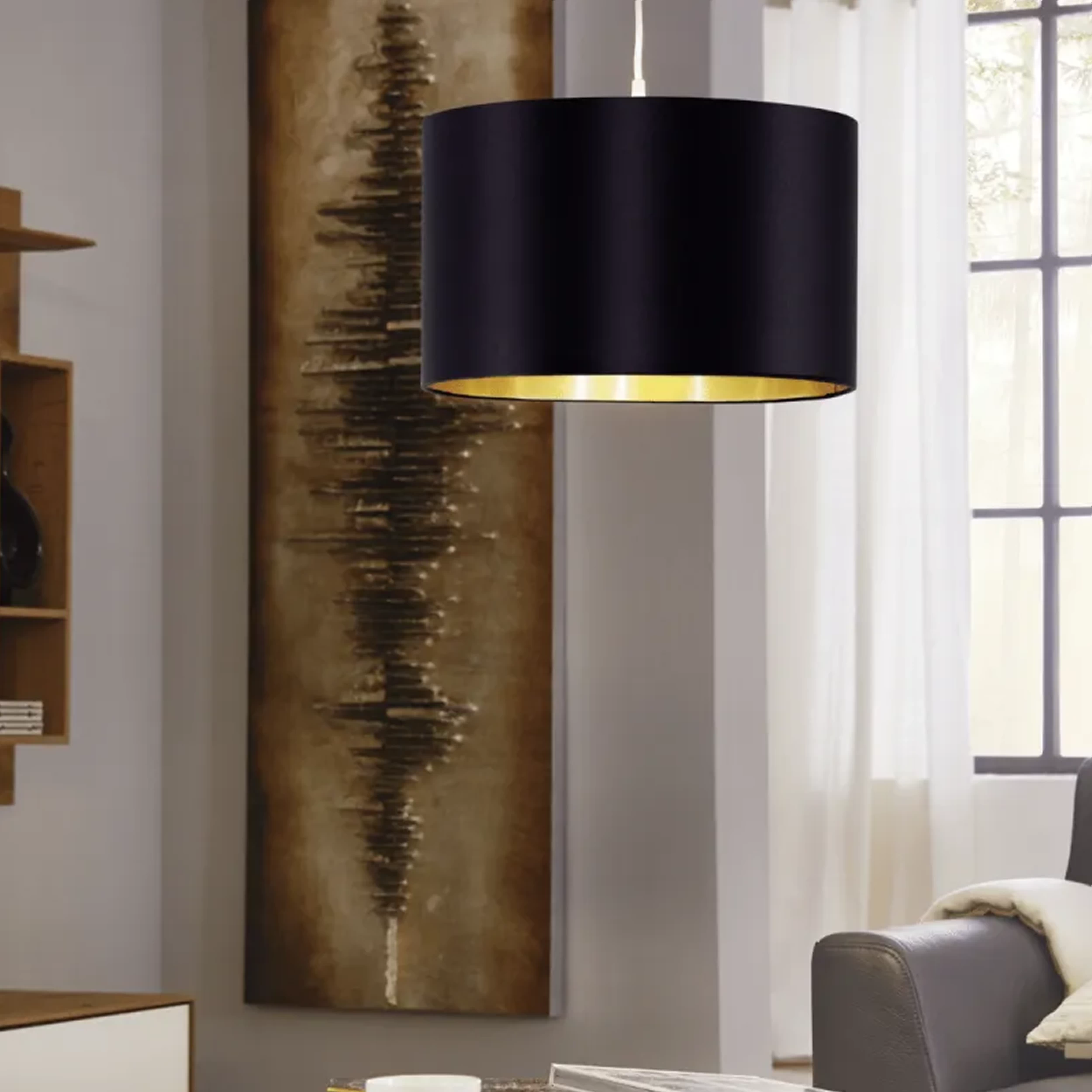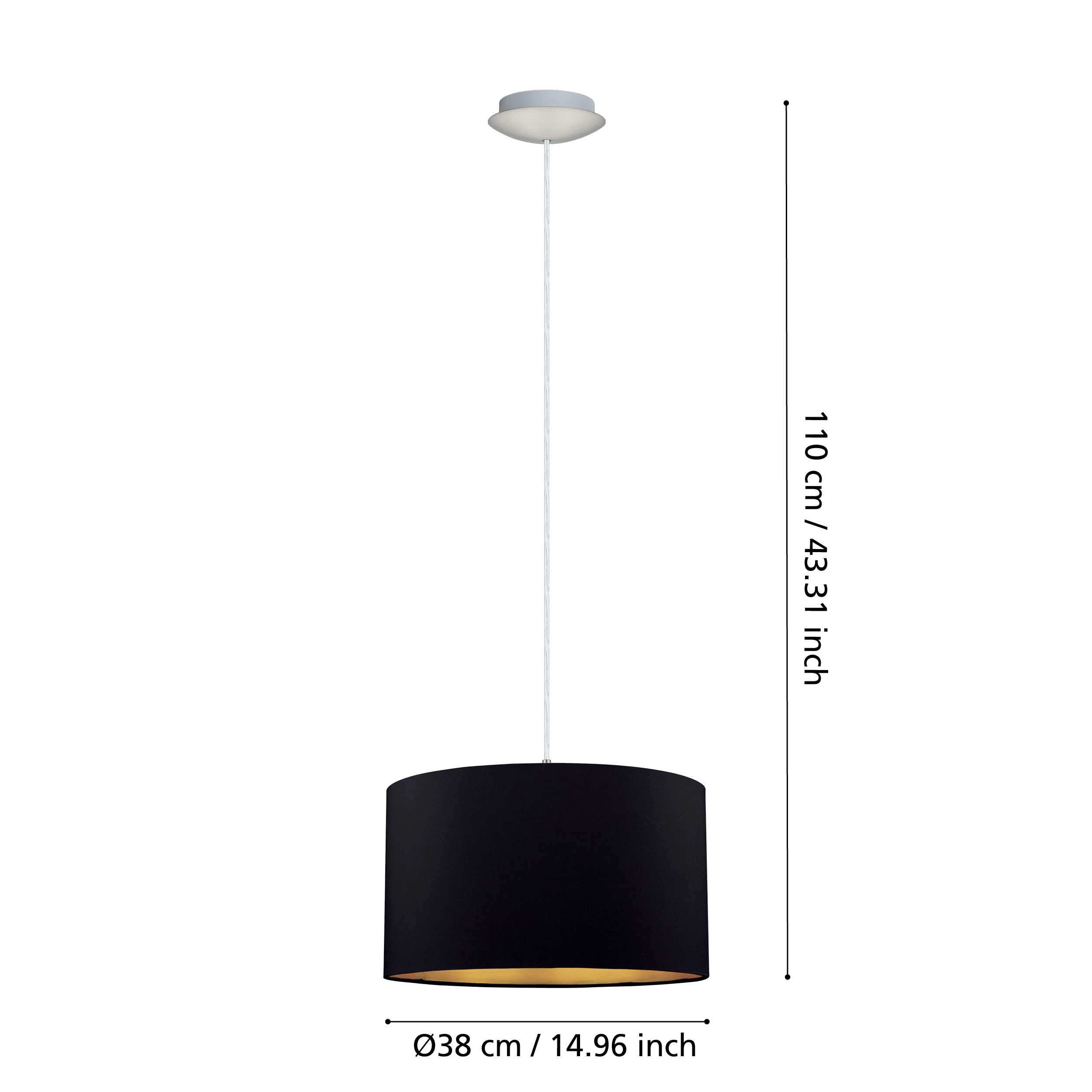 Elegantné závesné svietidlo EGLO Maserlo 31599 vnesie do vášho interiéru nádych luxusu a moderného štýlu. Dominantou tohto svietidla je okrúhle textilné tienidlo v nadčasovej čiernej farbe, ktoré v kombinácii s vnútornou zlatou stranou vytvára hrejivé a útulné osvetlenie. Matný niklový záves dodáva celému dizajnu stabilitu a technickú precíznosť. S priemerom 380 mm je ideálnou voľbou ako osvetlenie nad jedálenský stôl, do obývacej izby či spálne.