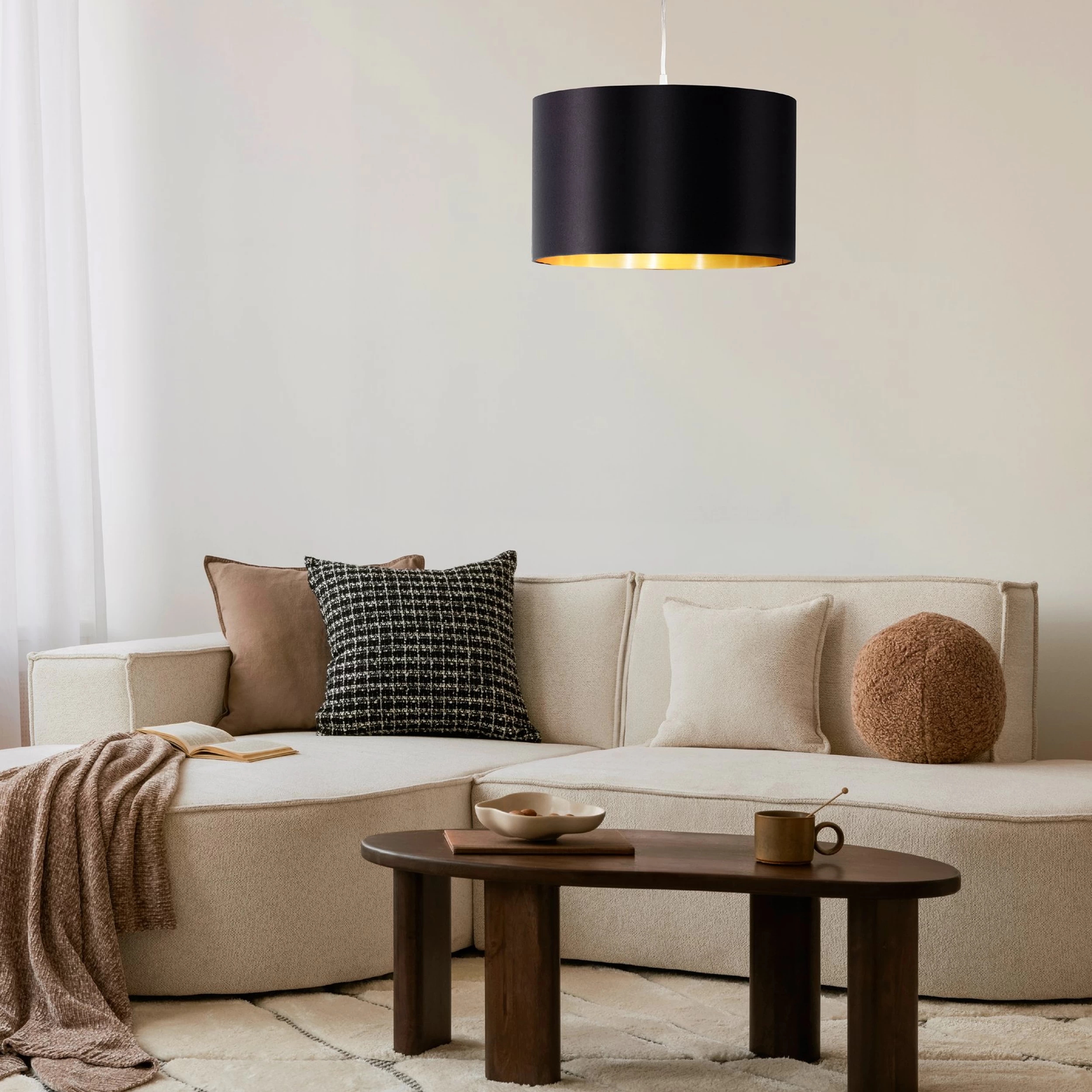 • Luxusná kombinácia čiernej textílie a zlatej vnútornej strany pre teplý svetelný efekt.• Univerzálna pätica E27 umožňuje použiť výkonné LED žiarovky podľa vašej voľby.