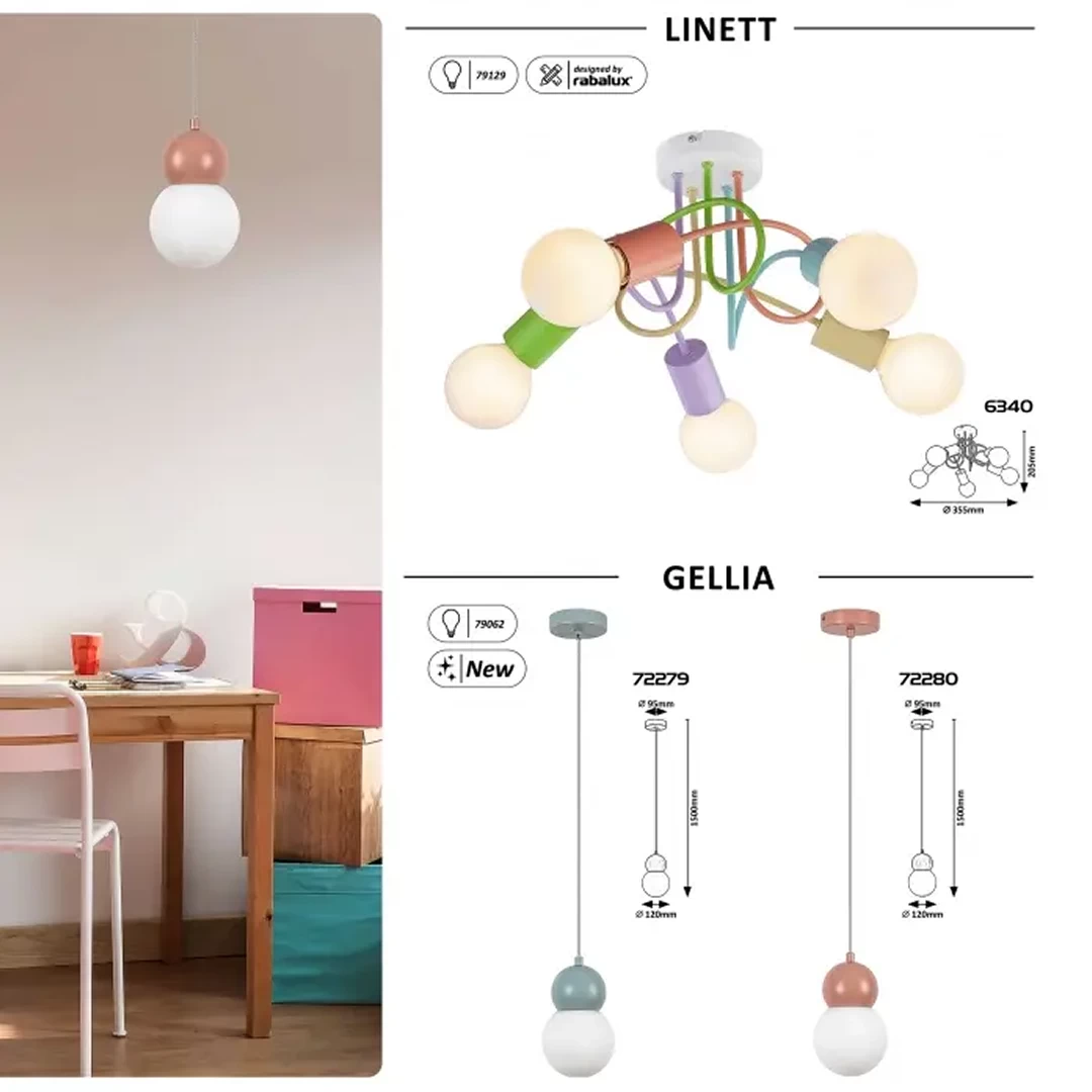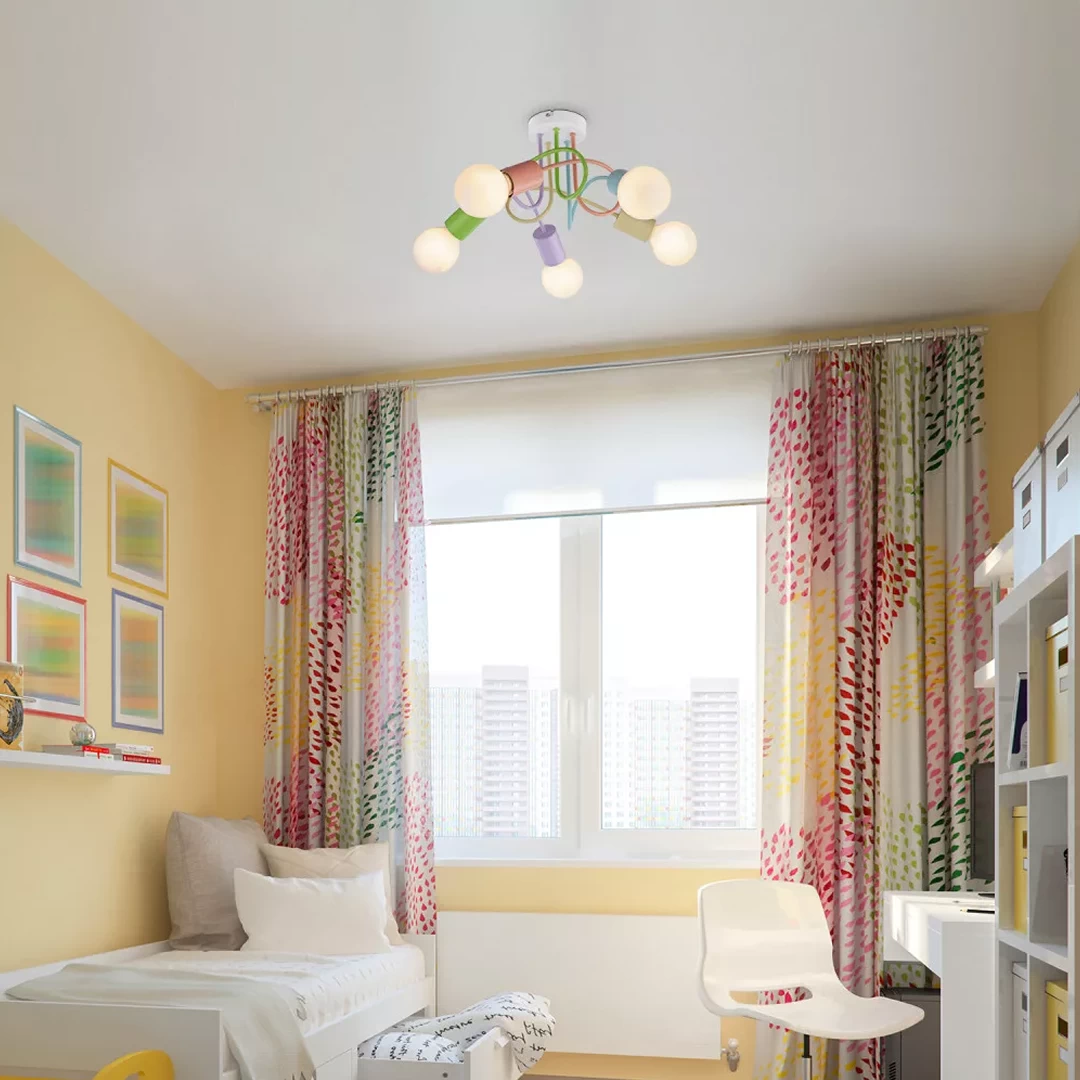 Rozžiarte kráľovstvo vašich ratolestí s hravým svietidlom Rabalux Linett 6340. Toto moderné interiérové svietidlo z dielne vlastných dizajnérov značky Rabalux prináša do detskej izby nielen potrebné svetlo, ale aj závan radosti a kreativity. Vďaka svojmu pestrofarebnému prevedeniu a unikátnemu tvaru s piatimi ramenami, ktoré smerujú do rôznych strán, zabezpečí rovnomerné osvetlenie celej miestnosti.
